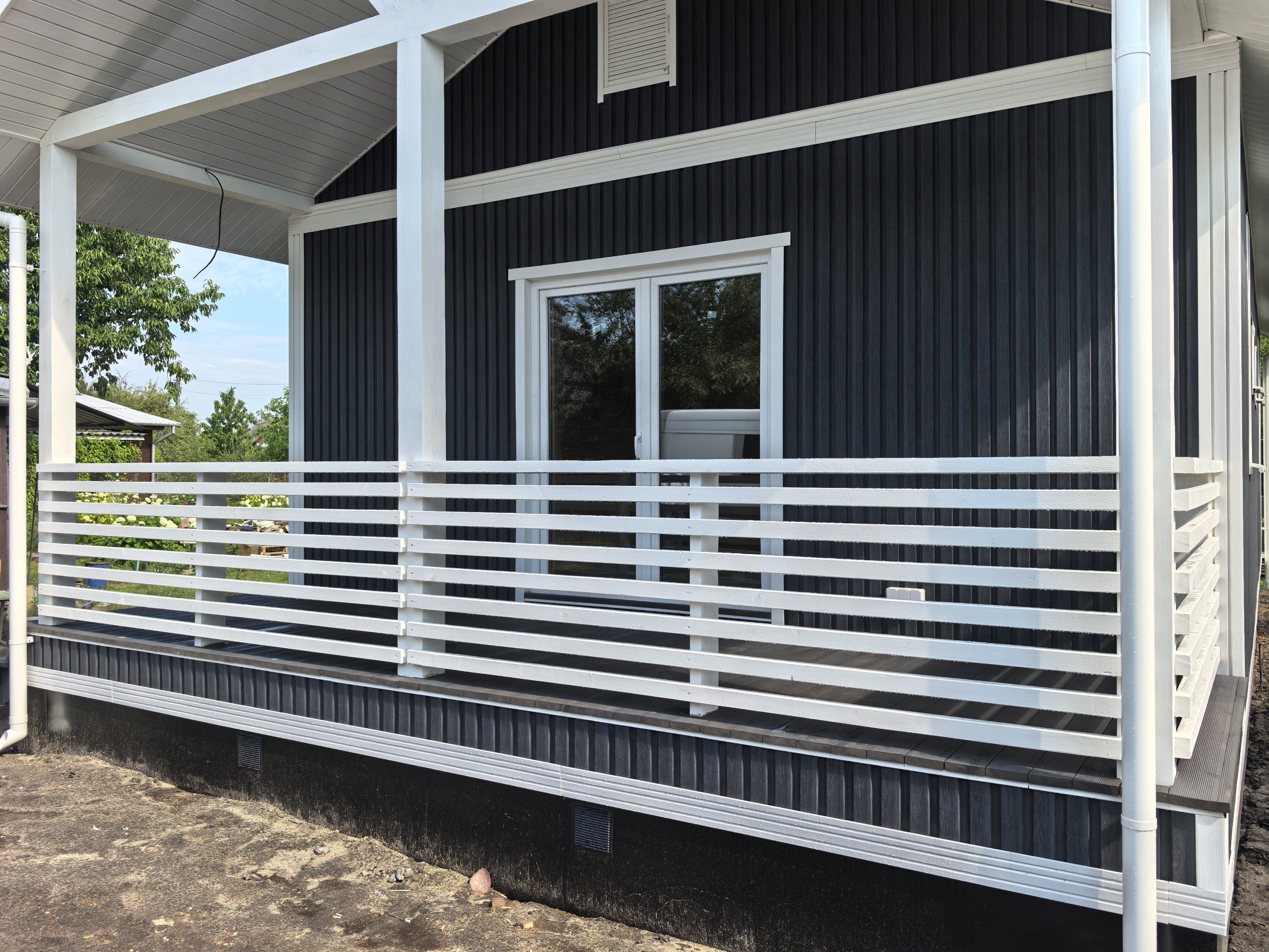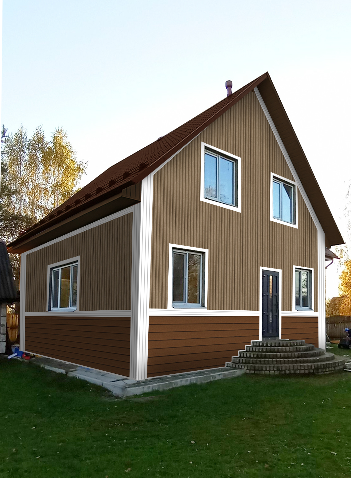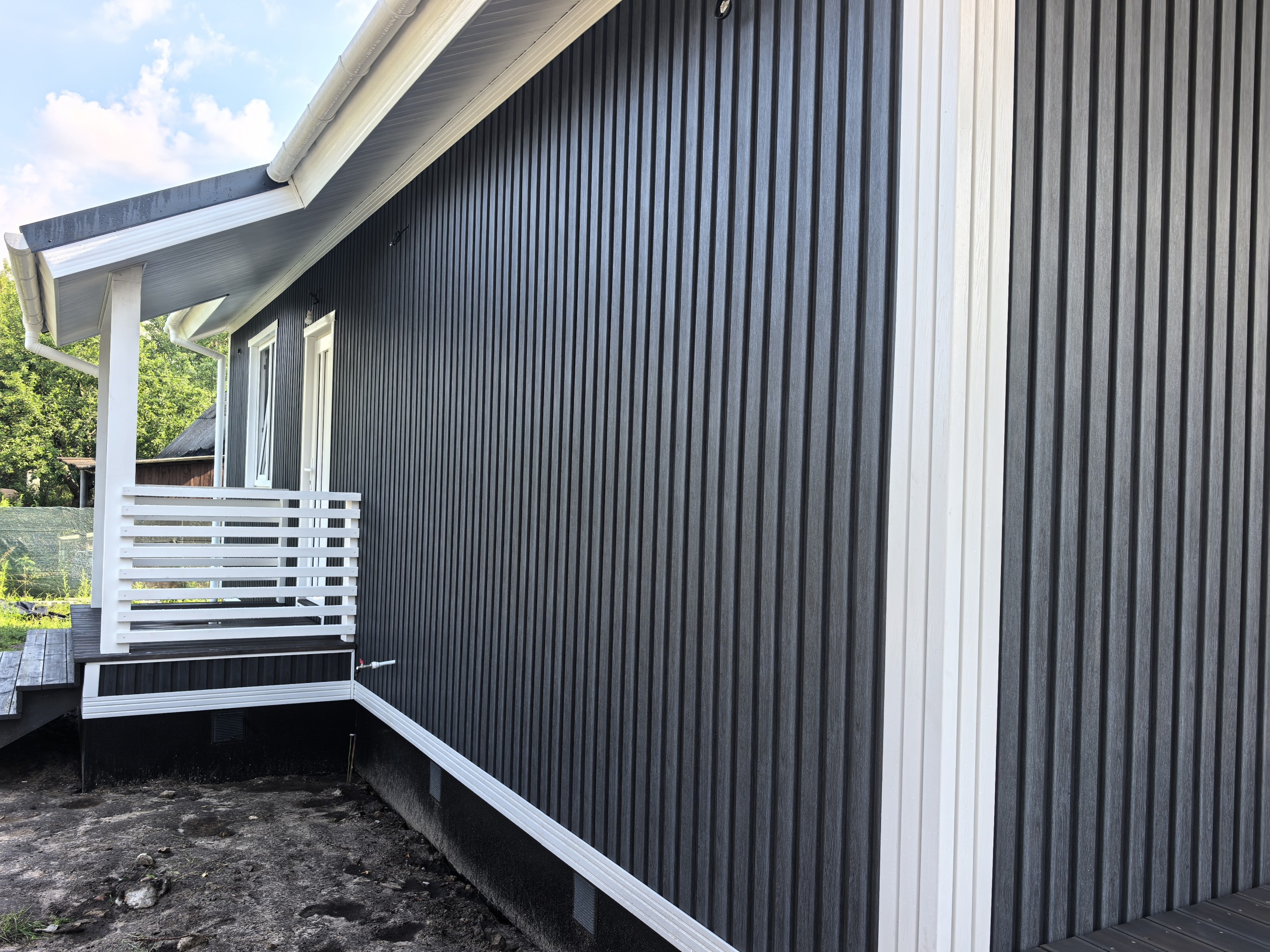 Такая облицовка отлично вписывается в проекты домов в современном, скандинавском и минималистичном стилях. Вертикальное направление монтажа визуально вытягивает фасад, делая здание выше и стройнее.